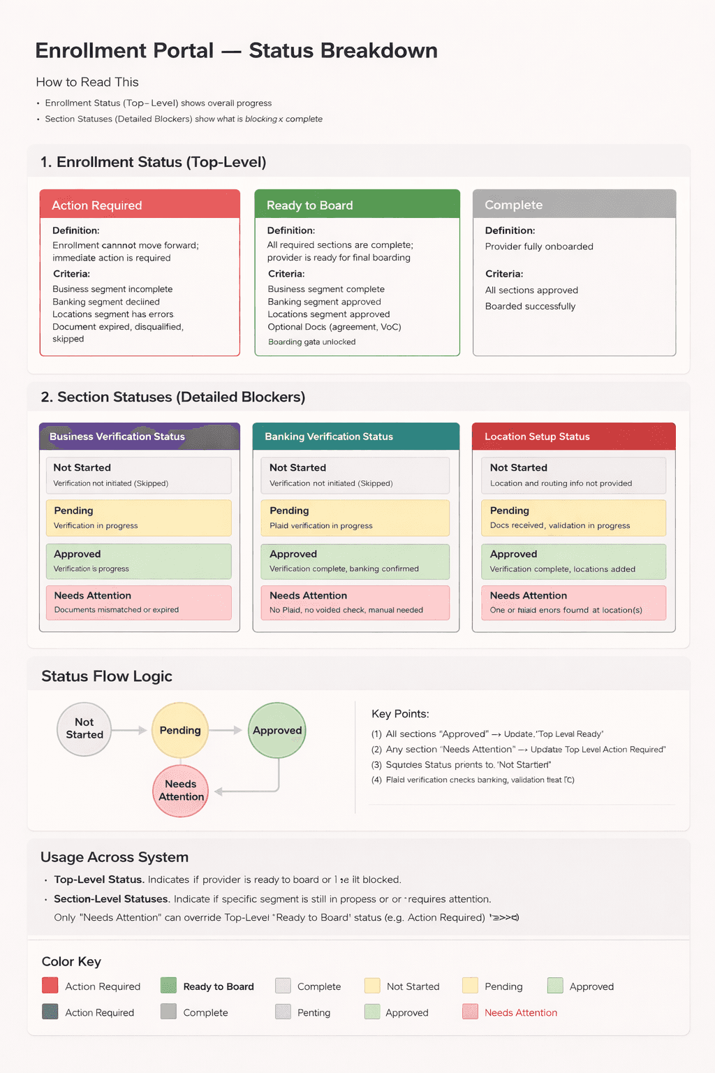 To explain why enrollment is blocked, each section (Business, Banking, Locations) uses consistent statuses: