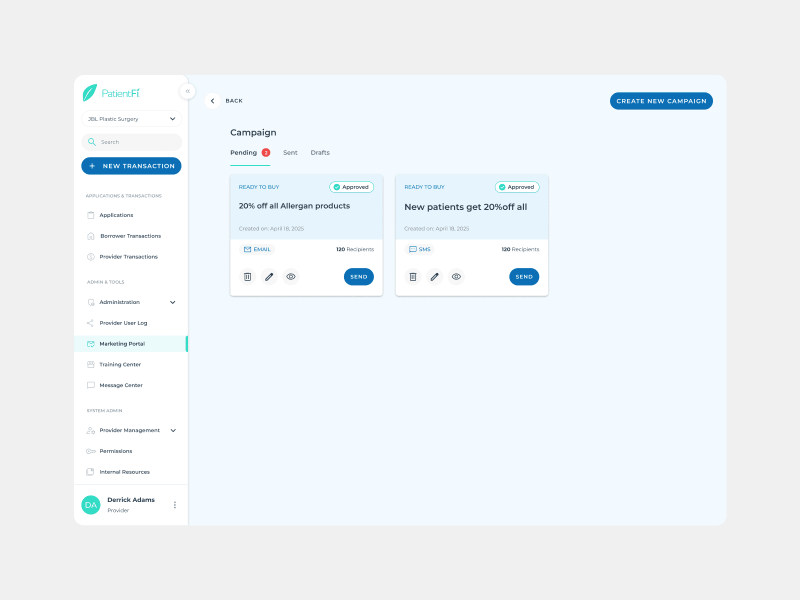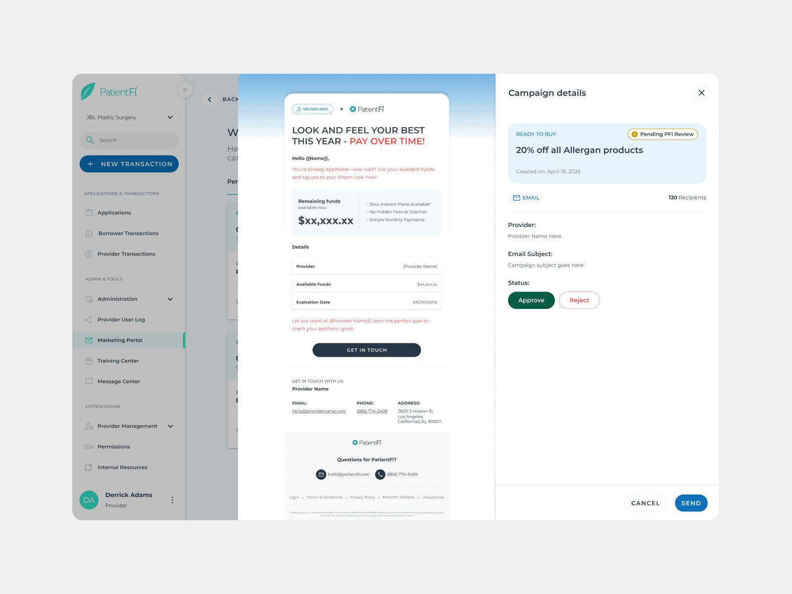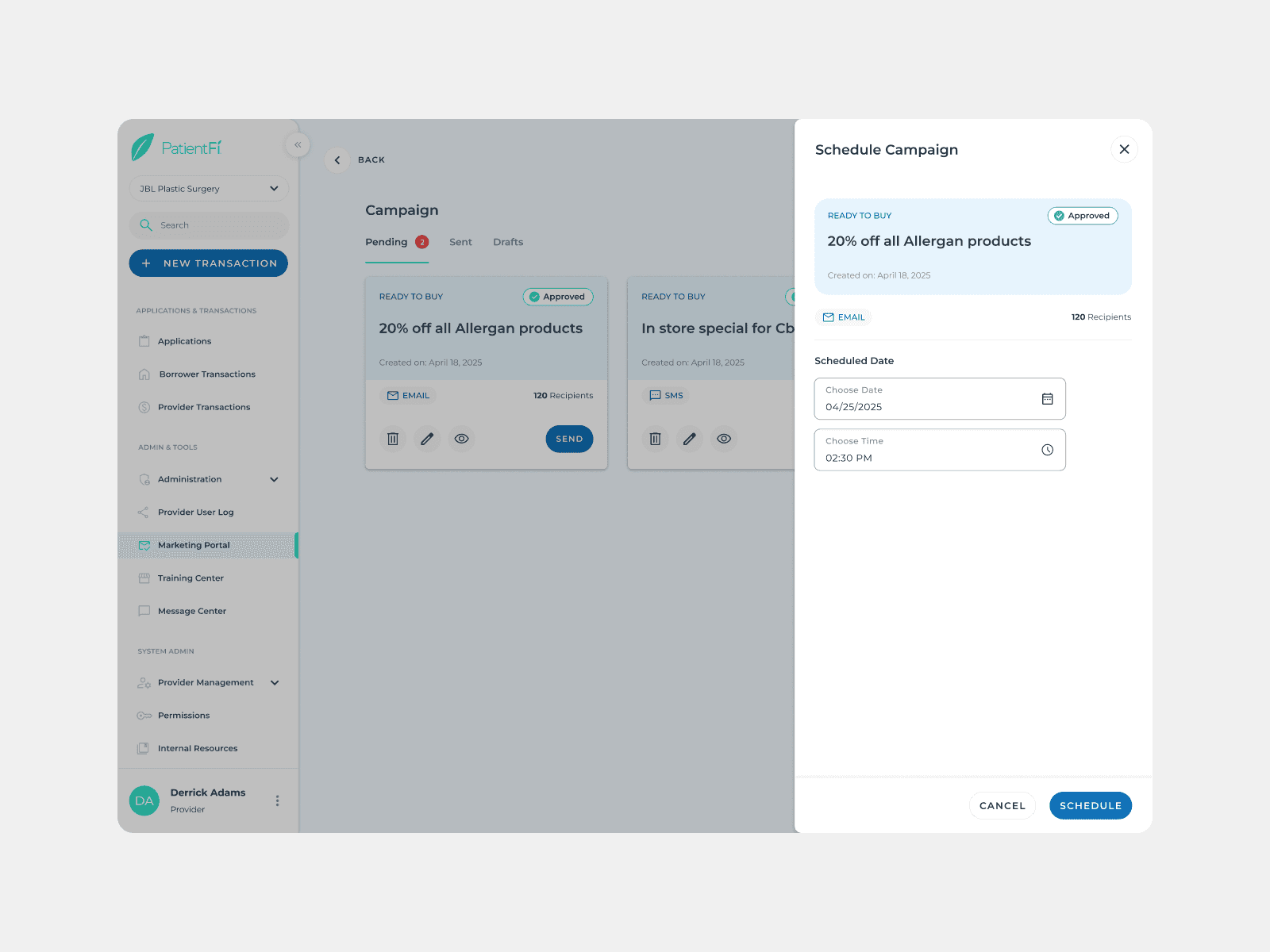 The Marketing Portal is a feature-flagged internal product that enables providers to create and schedule compliant Email and SMS campaigns targeting specific patient segments such as Open-to-Buy (OTB) and Intro to PatientFi audiences.