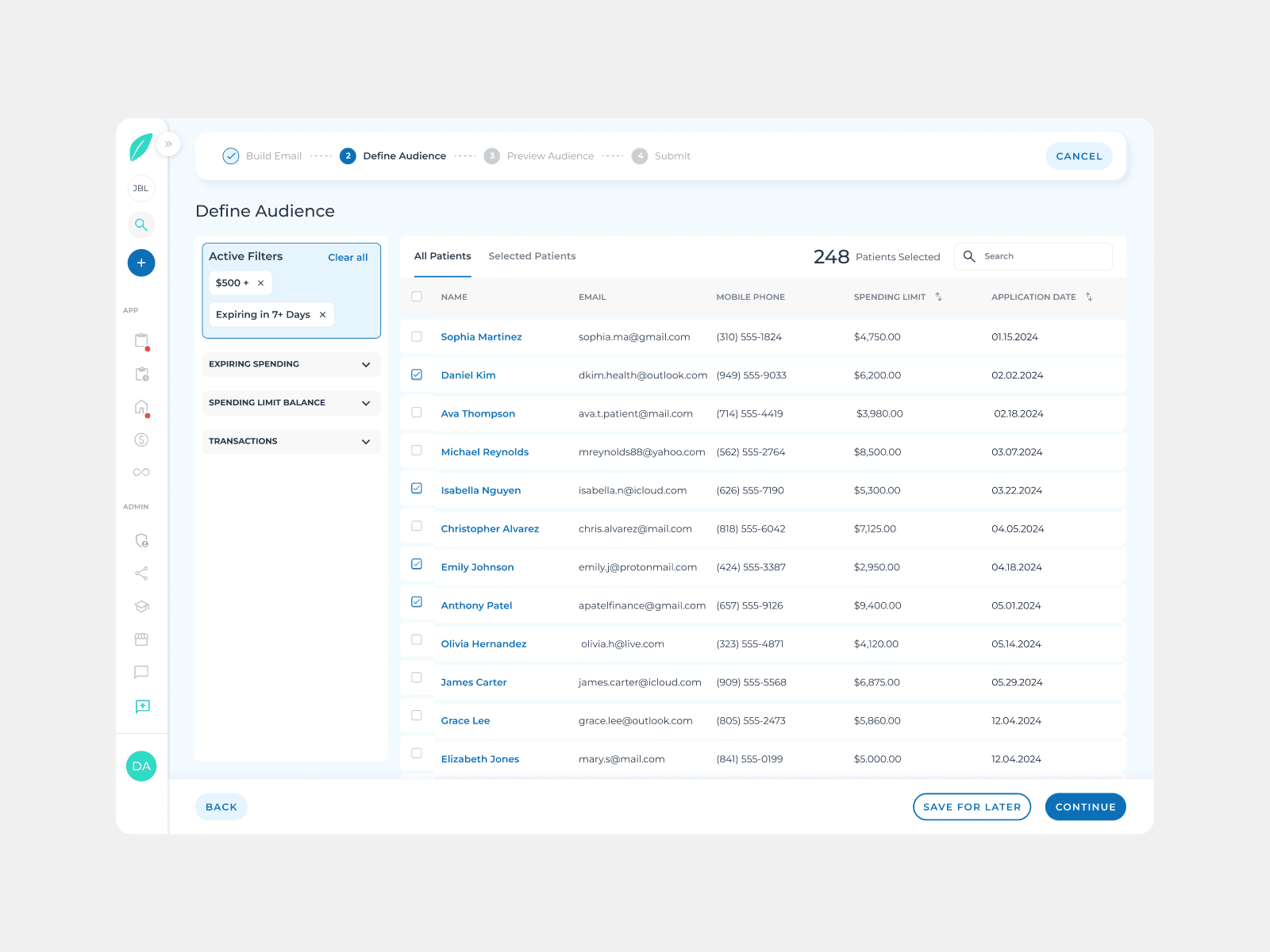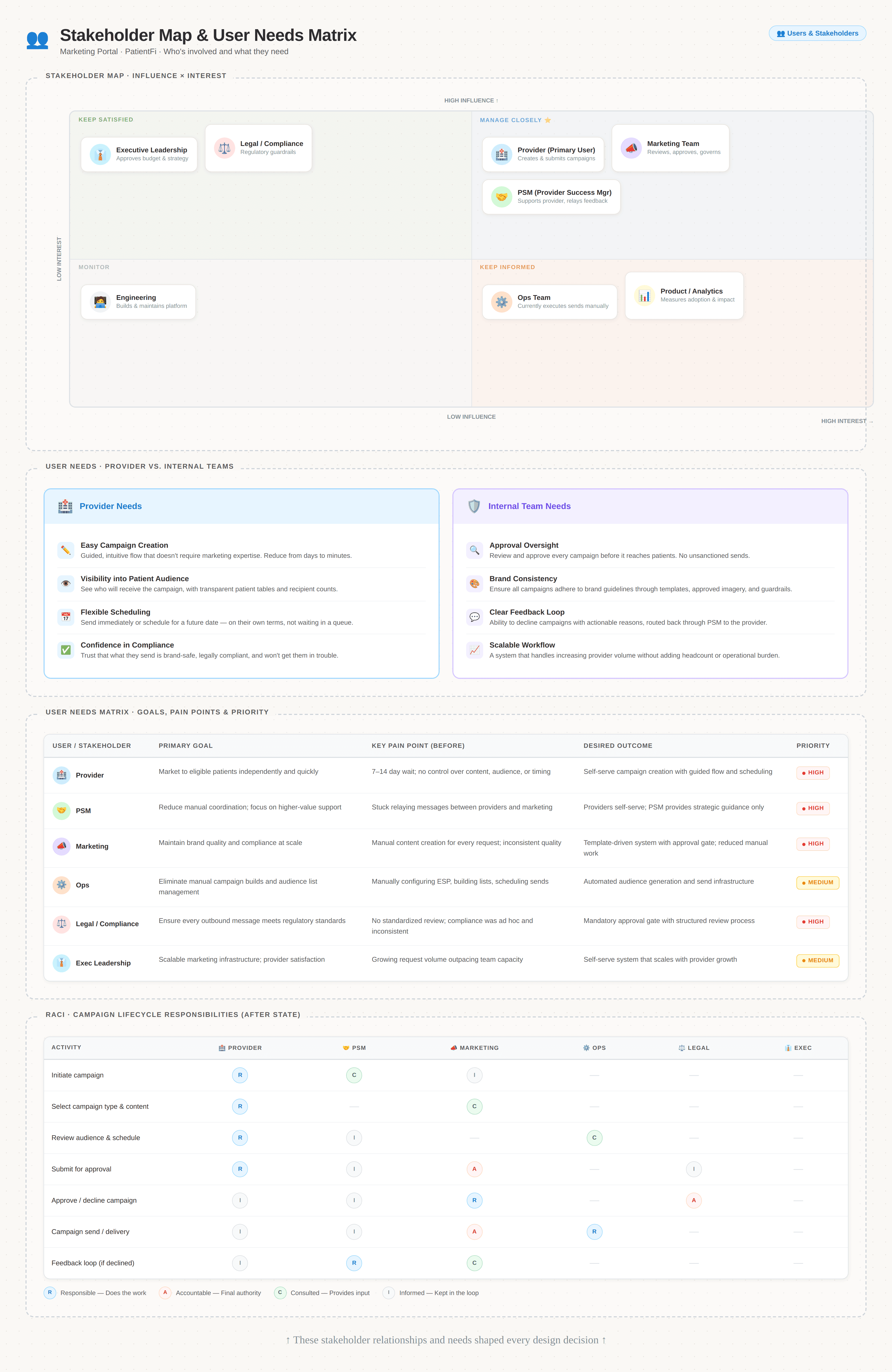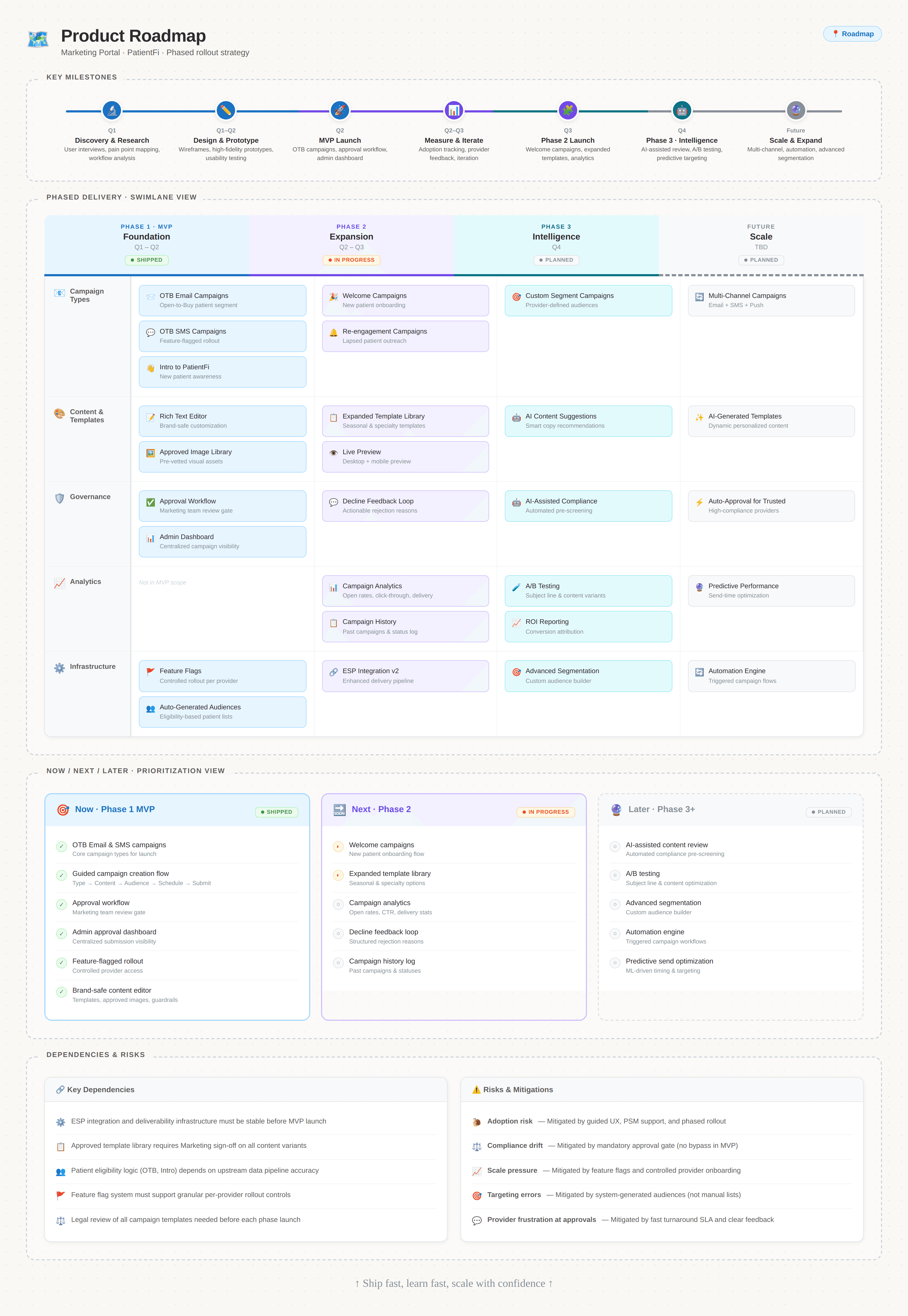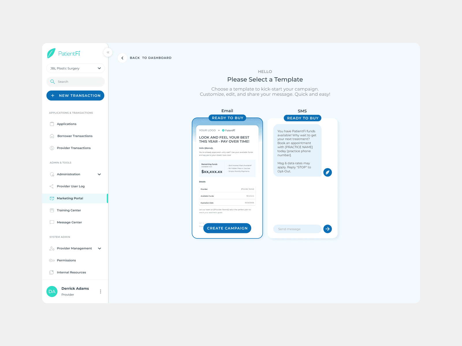 The Marketing Portal is a feature-flagged internal product that enables providers to create and schedule compliant Email and SMS campaigns targeting specific patient segments such as Open-to-Buy (OTB) and Intro to PatientFi audiences.
